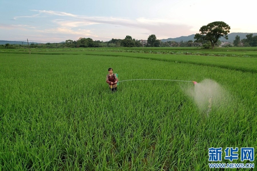 近日,在江西省撫州市廣昌縣,3.4萬多畝早稻正逐步進入分蘗期,稻田里綠油油一片,禾苗根壯、長勢喜人。農(nóng)民正忙著噴灑農(nóng)藥,進行防治病蟲害作業(yè),為夏糧豐產(chǎn)豐收打下基礎(chǔ)。(危仁鵬 徐維棟)