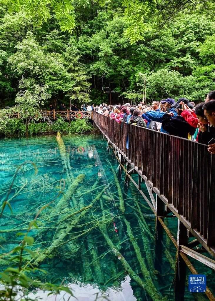 九寨溝景區(qū)五花海景點(diǎn)人流如織(6月7日攝)。