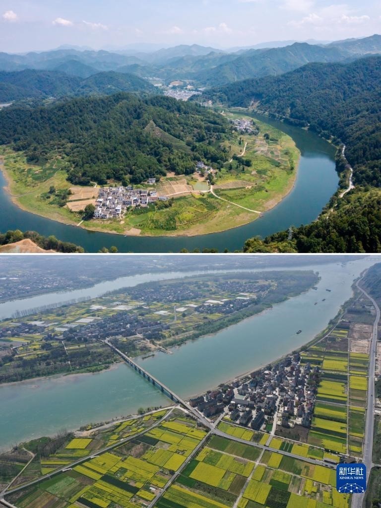 拼版照片:左圖為6月1日拍攝的安徽省黃山市歙縣新安江風景(新華社記者張端攝);右圖為2020年9月6日拍攝的浙江省桐廬縣蘆茨村一景(無人機照片,新華社記者黃宗治攝)。