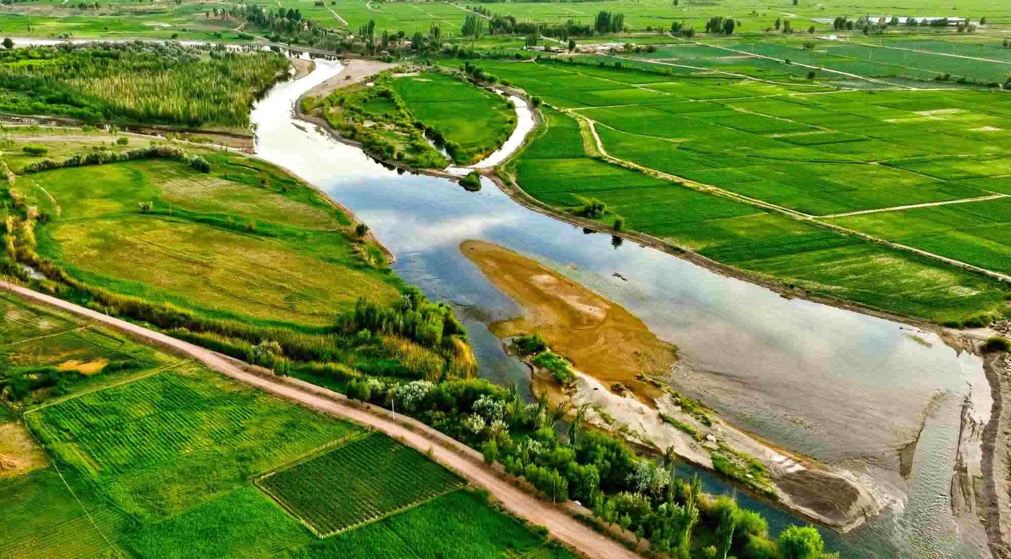 2023年6月15日,甘肅省張掖市,甘州區(qū)靖安鄉(xiāng)、臨澤縣板橋鎮(zhèn)境內(nèi)的黑河兩岸,寬闊的河床、彎曲的河流、農(nóng)作物以及樹木、蘆葦、濕地在夕陽的映照下綠意盎然。視覺中國