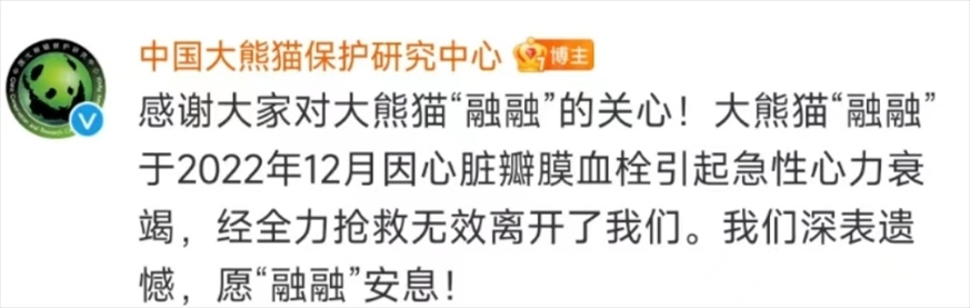 大熊貓“融融”于2022年12月因心臟瓣膜血栓引起急性心力衰竭,經(jīng)全力搶救無(wú)效離開了我們。我們深表遺憾,愿“融融”安息!
