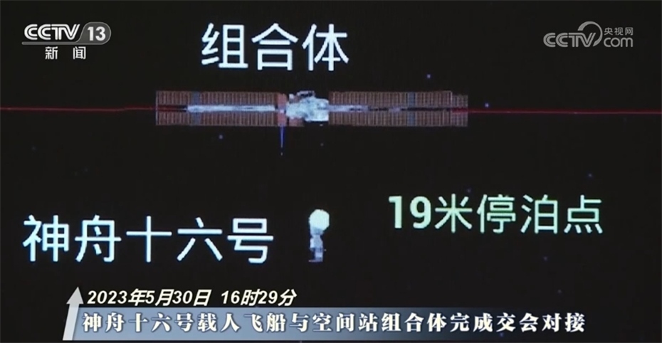 2023年5月30日16時29分 神舟十六號載人飛船與空間站組合體完成交會對接