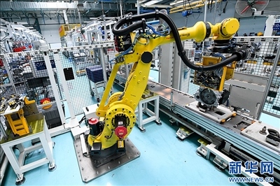 在位于哈爾濱市平房區(qū)哈爾濱東安汽車動力股份有限公司生產(chǎn)車間,工業(yè)機(jī)器人在生產(chǎn)作業(yè)。