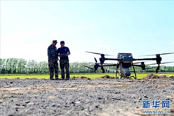 北大荒集團(tuán)二九〇農(nóng)場有限公司農(nóng)技人員正指導(dǎo)種植戶使用無人機(jī)。