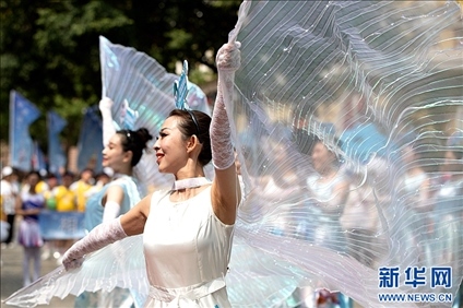 在哈爾濱市中央大街上,人們參加巡游慶?;顒印?/p>