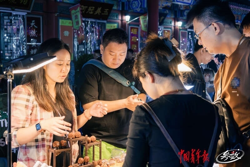 夜幕降臨,北京潘家園舊貨市場(chǎng)內(nèi)的周三夜場(chǎng)開啟,攤位上亮起了一盞盞照明的小燈,很多年輕人正在攤位前選購(gòu)商品。實(shí)習(xí)生 邱嵐/攝