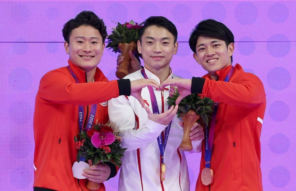 9月29日,亞軍日本選手北園丈琉、冠軍中國(guó)選手鄒敬園和季軍日本選手谷川翔(左至右)在體操男子雙杠頒獎(jiǎng)儀式上。