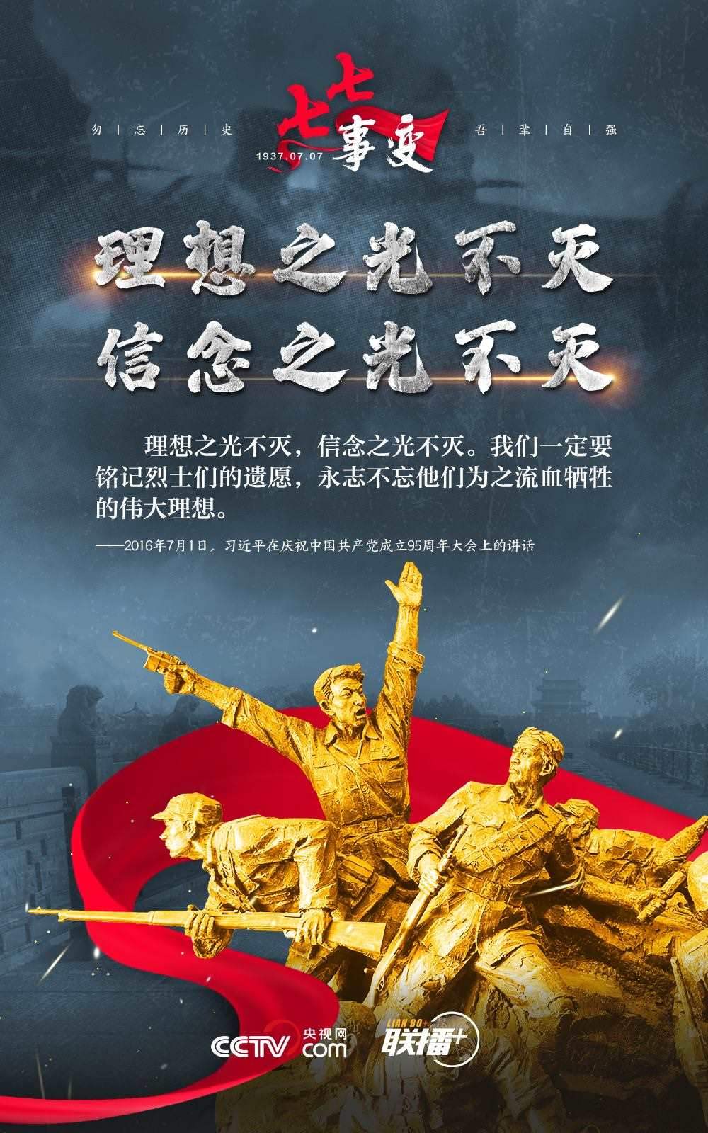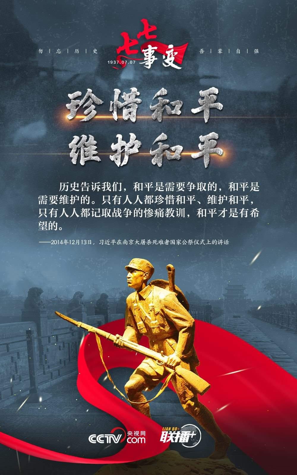 悼念同胞,緬懷先烈。勿忘歷史,吾輩自強(qiáng)!在“七七事變”86周年之際,央視網(wǎng)《聯(lián)播+》欄目特推出海報(bào),與您一起從總書記講話中汲取自強(qiáng)不息的奮進(jìn)力量。