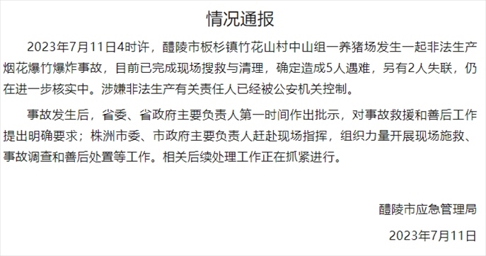 ·11日,湖南醴陵發(fā)生一起非法生產(chǎn)煙花爆竹爆炸事故,造成5人遇難,2人失聯(lián),涉嫌非法生產(chǎn)有關(guān)責(zé)任人已被公安機(jī)關(guān)控制,案件仍在進(jìn)一步核實中。