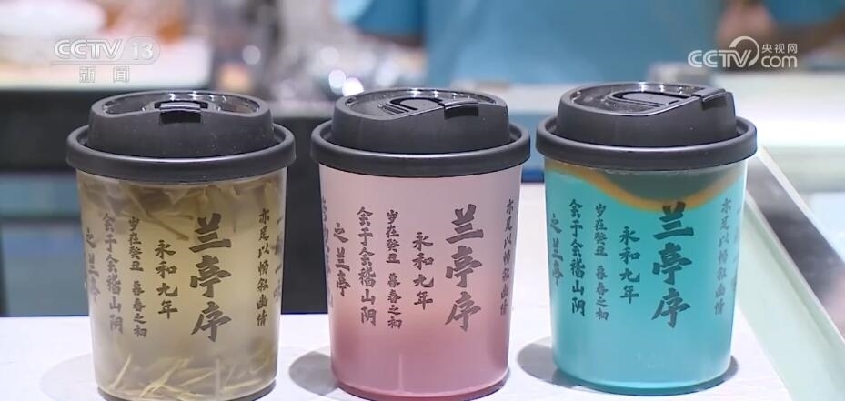 唯美的詩詞也成為了文創(chuàng)產(chǎn)品的創(chuàng)意之源。這杯文創(chuàng)茶飲的杯身上就印著王羲之名作《蘭亭集序》的部分佳句,吸引了不少年輕消費者。