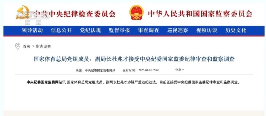 總臺(tái)央視記者 宋琎:今年3月27日,二十屆中央首輪巡視對(duì)象名單公布?!皩?duì)國家體育總局黨組開展機(jī)動(dòng)巡視”這一消息迅速成為社會(huì)熱點(diǎn)。之后不到一周,中央紀(jì)委國家監(jiān)委通報(bào),時(shí)任國家體育總局黨組成員、副局長杜兆才接受審查調(diào)查。體育領(lǐng)域反腐成為今年反腐敗工作的一大重點(diǎn)。