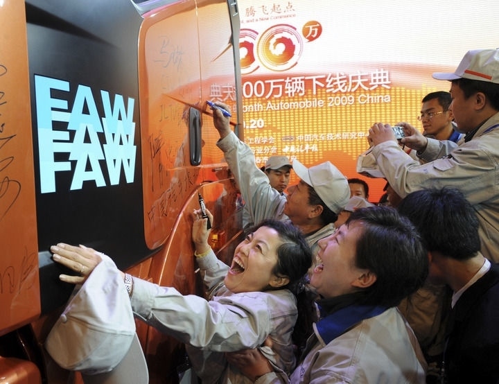2009年10月20日,一汽解放的工人們?cè)谧约河H手生產(chǎn)的2009年中國(guó)第1000萬(wàn)輛車(chē)上簽名。新華社記者 蔣林 攝