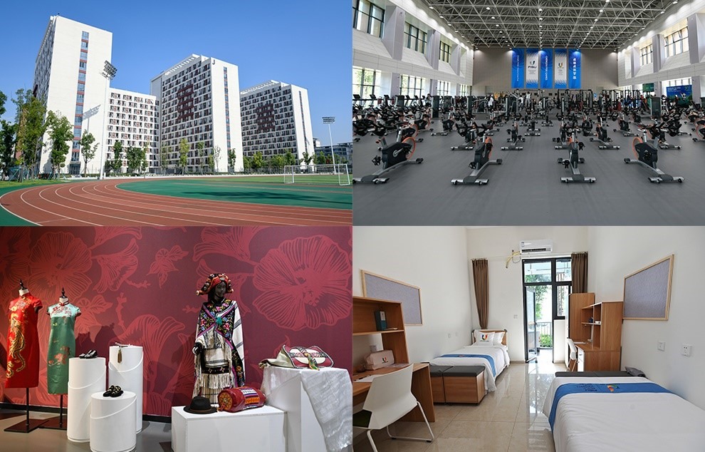 △左上圖是大運(yùn)村一處代表團(tuán)公寓。右上圖是大運(yùn)村健身中心的器械區(qū)。左下圖是大運(yùn)村展覽中心內(nèi)的特色服飾展區(qū)。右下圖是大運(yùn)村一間運(yùn)動員宿舍。