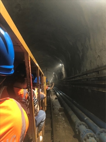 圖為采風(fēng)團(tuán)乘坐纜車前往江門中微子地下實驗室。(新華網(wǎng) 王慰攝)