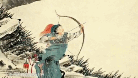 描繪了女將軍在山林中挽弓射箭的情景