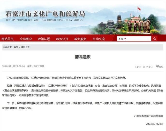 ·石家莊通報樂隊歌手商演不當(dāng)行為:涉事者被拘,公司停業(yè)整頓。