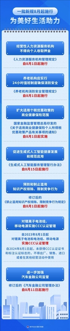 ·一批民生新規(guī)8月開始施行。從完善人力資源服務(wù)機(jī)構(gòu)管理,到強(qiáng)化養(yǎng)老機(jī)構(gòu)消防安全;從擴(kuò)大適用個稅優(yōu)惠政策的商業(yè)健康保險范圍,到規(guī)范生成式人工智能服務(wù)……法治,為美好生活助力。