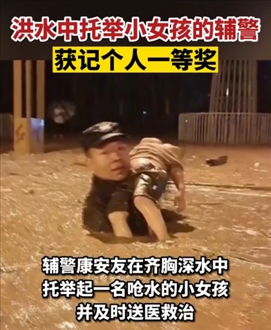 近日,四川瀘州古藺遭遇暴雨洪災(zāi)多人被困。輔警康安友在齊胸深水中托舉起一名嗆水的小女孩,并及時送醫(yī)救治。7月29日,康安友獲記個人一等獎。