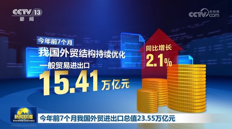 央視網(wǎng)消息(新聞聯(lián)播):海關(guān)總署今天(8月8日)對(duì)外公布,今年前7個(gè)月,我國(guó)貨物貿(mào)易進(jìn)出口總值23.55萬(wàn)億元,外貿(mào)運(yùn)行平穩(wěn)、符合預(yù)期。