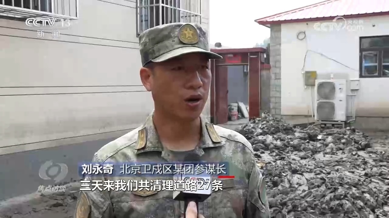 北京衛(wèi)戍區(qū)某團(tuán)參謀長劉永奇:“三天來,我們共清理道路27條,面積28000余平方米,淤泥700余立方米,廢舊垃圾1300余立方米,全面疏通了各條道路。”