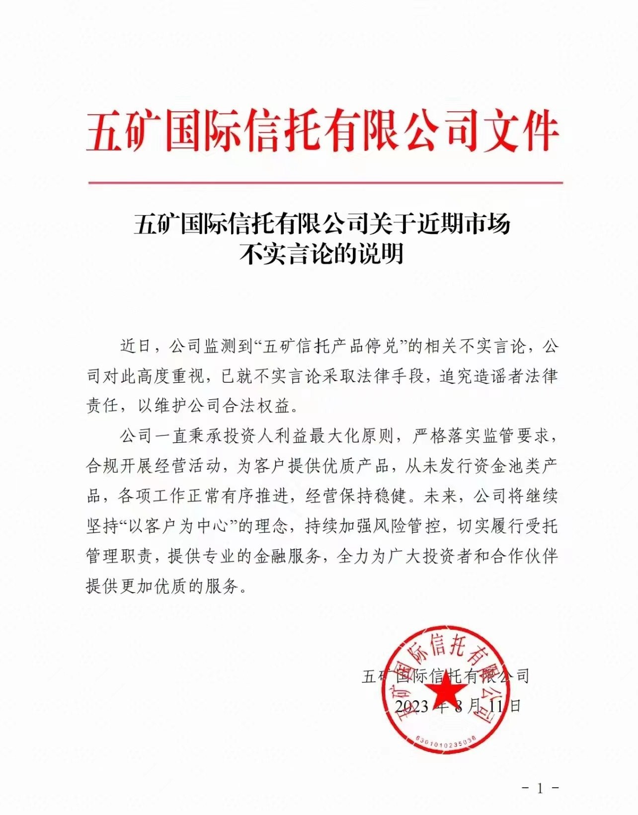 五礦國(guó)際信托有限公司(下稱“五礦信托”)發(fā)布聲明稱,近日,公司監(jiān)測(cè)到“五礦信托產(chǎn)品停兌”的相關(guān)不實(shí)言論,公司對(duì)此高度重視,已就不實(shí)言論采取法律手段,追究造謠者法律責(zé)任,以維護(hù)公司合法權(quán)益。公司一直秉承投資人利益最大化原則,嚴(yán)格落實(shí)監(jiān)管要求,合規(guī)開展經(jīng)營(yíng)活動(dòng),為客戶提供優(yōu)質(zhì)產(chǎn)品,從未發(fā)行資金池類產(chǎn)品,各項(xiàng)工作正常有序推進(jìn),經(jīng)營(yíng)保持穩(wěn)健。