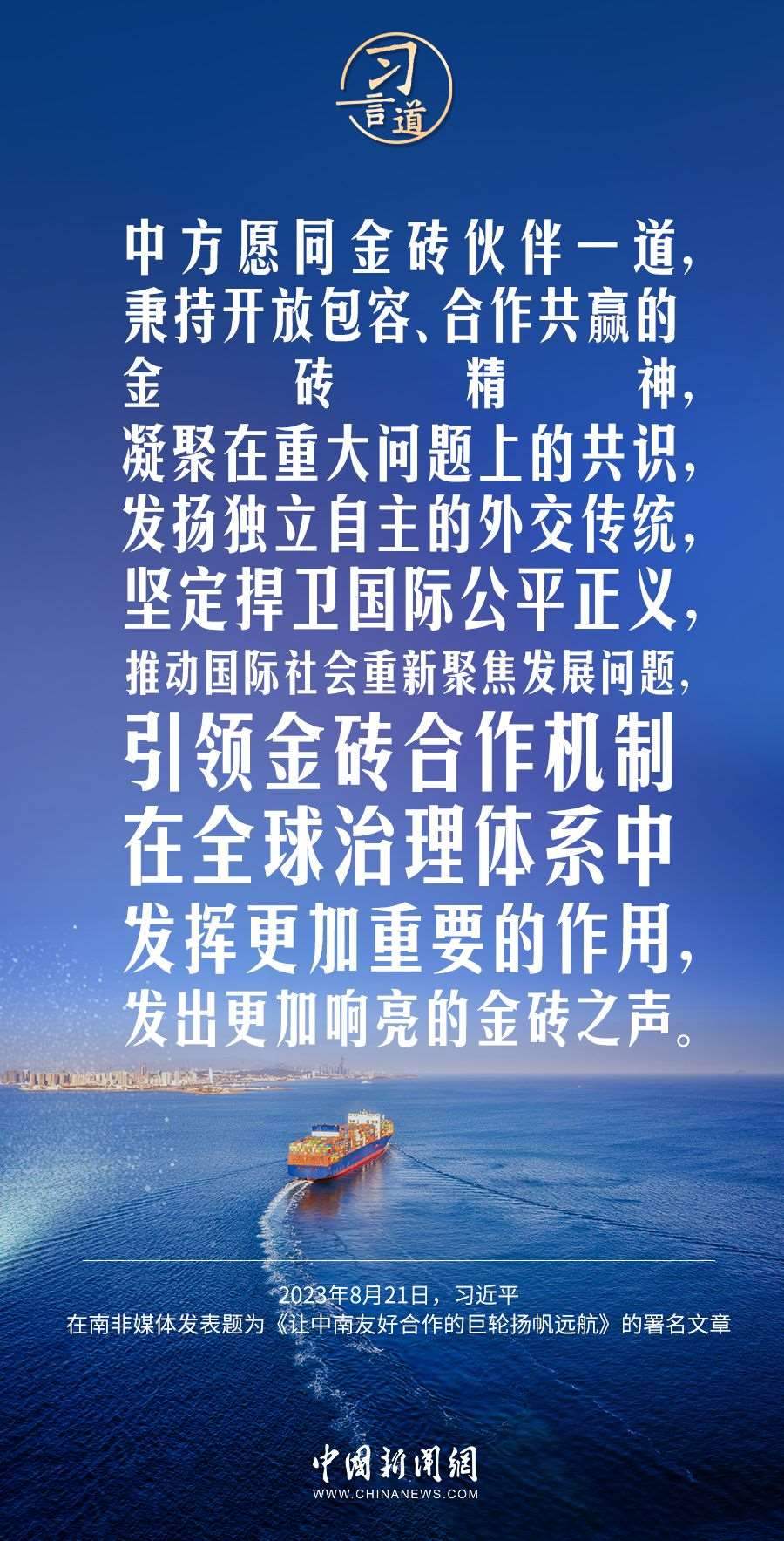 8月21日,在赴約翰內(nèi)斯堡出席金磚國(guó)家領(lǐng)導(dǎo)人第十五次會(huì)晤并對(duì)南非進(jìn)行國(guó)事訪問之際,國(guó)家主席習(xí)近平在南非《星報(bào)》、《開普時(shí)報(bào)》、《水星報(bào)》和南非獨(dú)立媒體網(wǎng)站發(fā)表題為《讓中南友好合作的巨輪揚(yáng)帆遠(yuǎn)航》的署名文章。習(xí)近平指出——