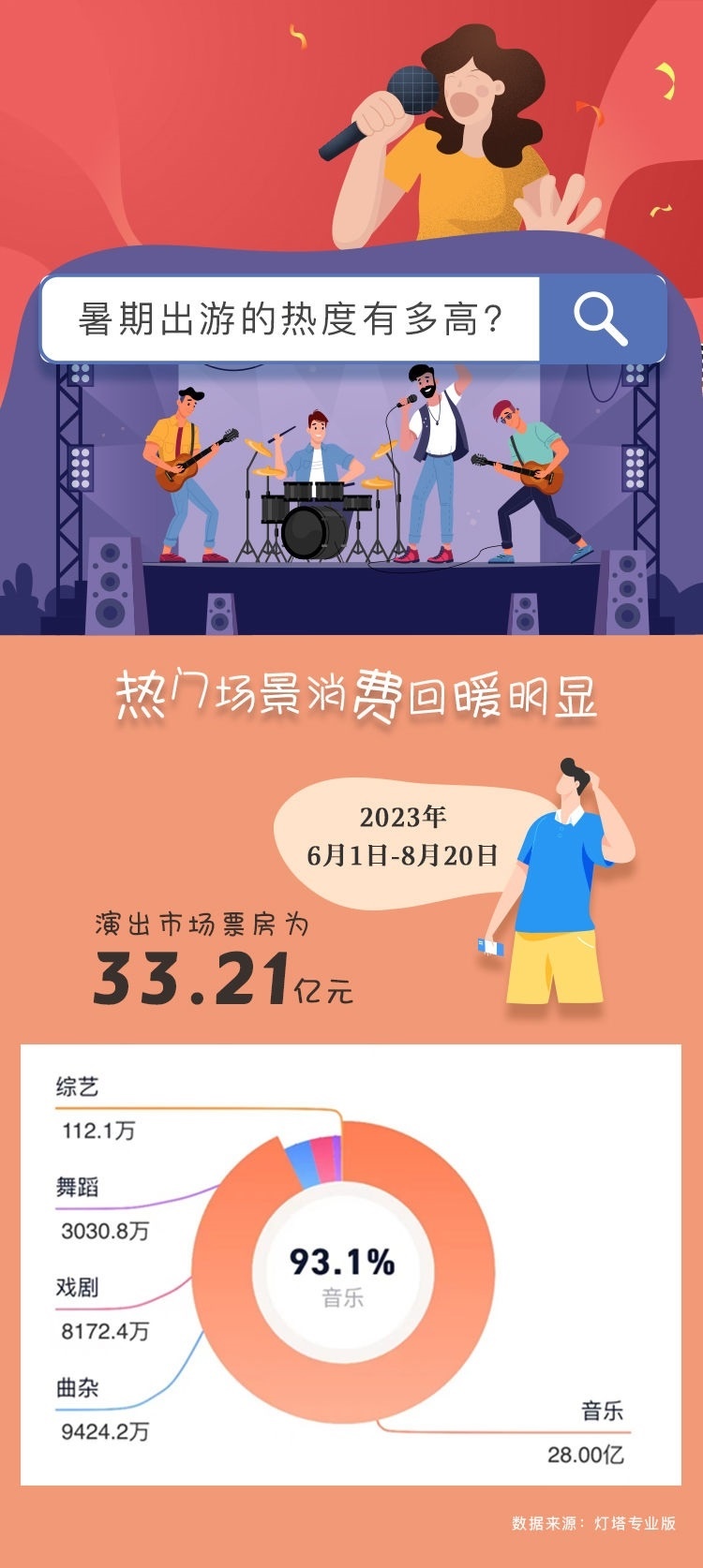 作為演出市場(chǎng)的傳統(tǒng)旺季,暑假期間演唱會(huì)、Live house、戲劇、音樂劇等各類熱門演出“一票難求”。根據(jù)燈塔專業(yè)版最新數(shù)據(jù),暑期檔中的6月1日至8月23日演出市場(chǎng)票房已經(jīng)超過(guò)30億元,而相當(dāng)可觀的跨城觀演比例,更引得除了演出票房之外的周邊產(chǎn)業(yè)一起火?!耙粋€(gè)演出圈粉一座城”,當(dāng)?shù)芈糜谓?jīng)濟(jì)不斷涌現(xiàn)新的可能。