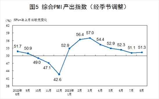 8月份,綜合PMI產(chǎn)出指數(shù)為51.3%,比上月上升0.2個百分點,繼續(xù)保持在擴張區(qū)間,表明我國企業(yè)生產(chǎn)經(jīng)營活動總體穩(wěn)定擴張。