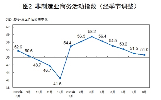 8月份,非制造業(yè)商務活動指數(shù)為51.0%,比上月下降0.5個百分點,仍高于臨界點,非制造業(yè)持續(xù)擴張。