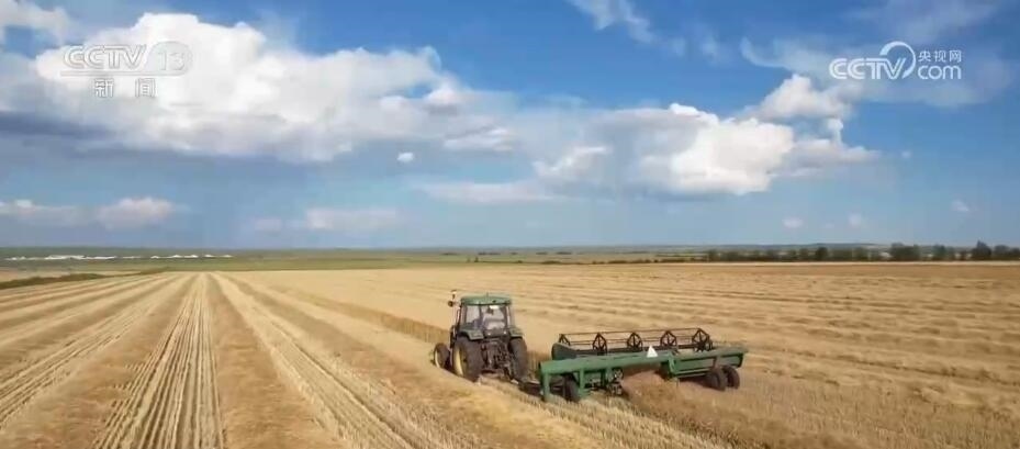 在呼倫貝爾牙克石市豐源農場,幾臺大型收割機正在麥田里往返穿梭,一壟壟成熟的小麥被卷進機器,收割、晾曬一氣呵成。