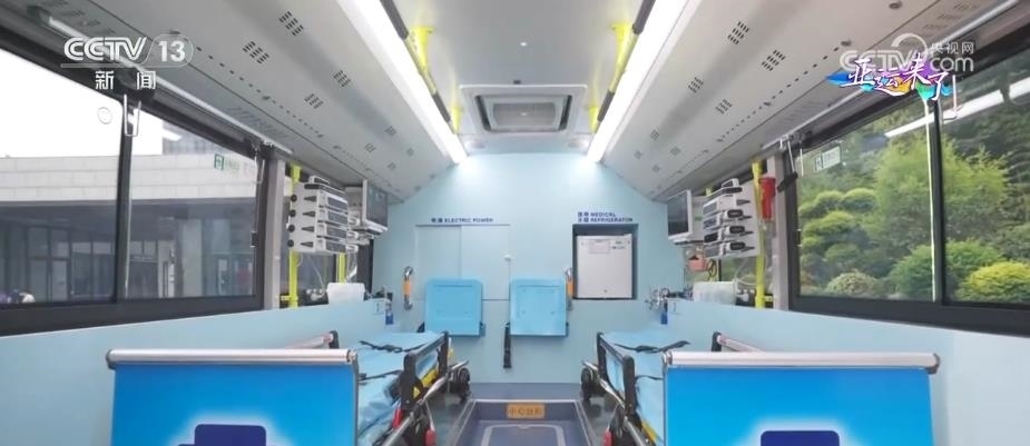大型5G移動急救復(fù)蘇單元由兩輛公交車改裝而成,包含1輛急救治療車和1輛急救指揮車。急救治療車內(nèi)設(shè)有2個擔架位和1個搶救床位,可同時轉(zhuǎn)運多名危重病人。車內(nèi)配備了功能全面、集成度高的急救和轉(zhuǎn)運平臺,可以在車內(nèi)開展體外呼吸循環(huán)支持和緊急救命性手術(shù)等復(fù)雜急救手段。