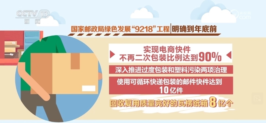2023年年底前,按照國家郵政局實(shí)施的綠色發(fā)展“9218”工程要求,電商快件不再二次包裝比例將達(dá)到90%,深入推進(jìn)過度包裝和塑料污染兩項(xiàng)治理,使用可循環(huán)快遞包裝的郵件快件達(dá)到10億件,回收復(fù)用質(zhì)量完好的瓦楞紙箱8億個(gè)。