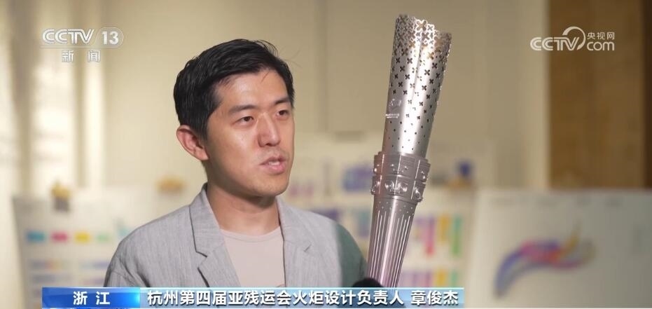 杭州第四屆亞殘運會火炬設(shè)計負責人 章俊杰:玉琮是實證中華五千年(文明史)的良渚(遺址)文明當中的一個重要禮器,我們把玉琮作為核心意象,外方內(nèi)圓,我們在舉起火炬的時候,所有人的視覺焦點玉琮它承上啟下,分別代表了不同的寓意。承上,我們用點點的星光匯聚成桂花桂冠,可以看到星光越來越稠密,這是我們希望體現(xiàn)整個火炬設(shè)計的積極向上的那種力量感;玉琮往下,在這個地方設(shè)計有幾十條的科技線,它就好像是綿延著人類的歷史和城市科技的脈絡(luò)。