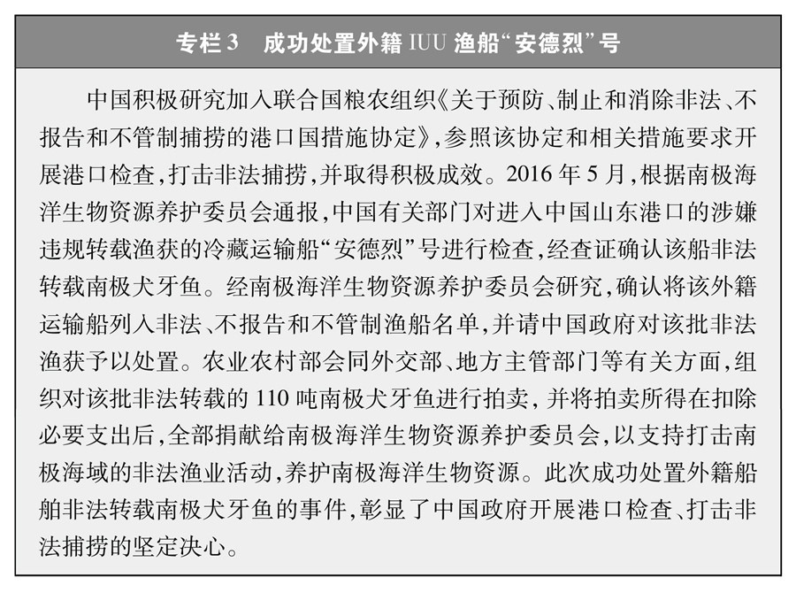 堅(jiān)決支持并積極配合國(guó)際社會(huì)打擊各種非法漁業(yè)活動(dòng)。2020年起,中國(guó)每年派遣執(zhí)法船赴北太平洋公海開展?jié)O業(yè)執(zhí)法巡航,查處違規(guī)作業(yè)行為。2016年,配合南極海洋生物資源養(yǎng)護(hù)委員會(huì)成功扣押處置了一艘外籍漁船非法轉(zhuǎn)載南極犬牙魚案件。2018年起,將中國(guó)加入的相關(guān)區(qū)域漁業(yè)管理組織公布的非法、不報(bào)告和不管制漁船名單通報(bào)國(guó)內(nèi)各港口,拒絕此類漁船進(jìn)港以及卸貨、補(bǔ)給、加油等活動(dòng)。