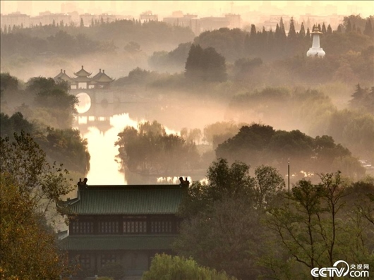 江蘇揚州,瘦西湖風景區(qū)云霧繚繞,如夢似幻。