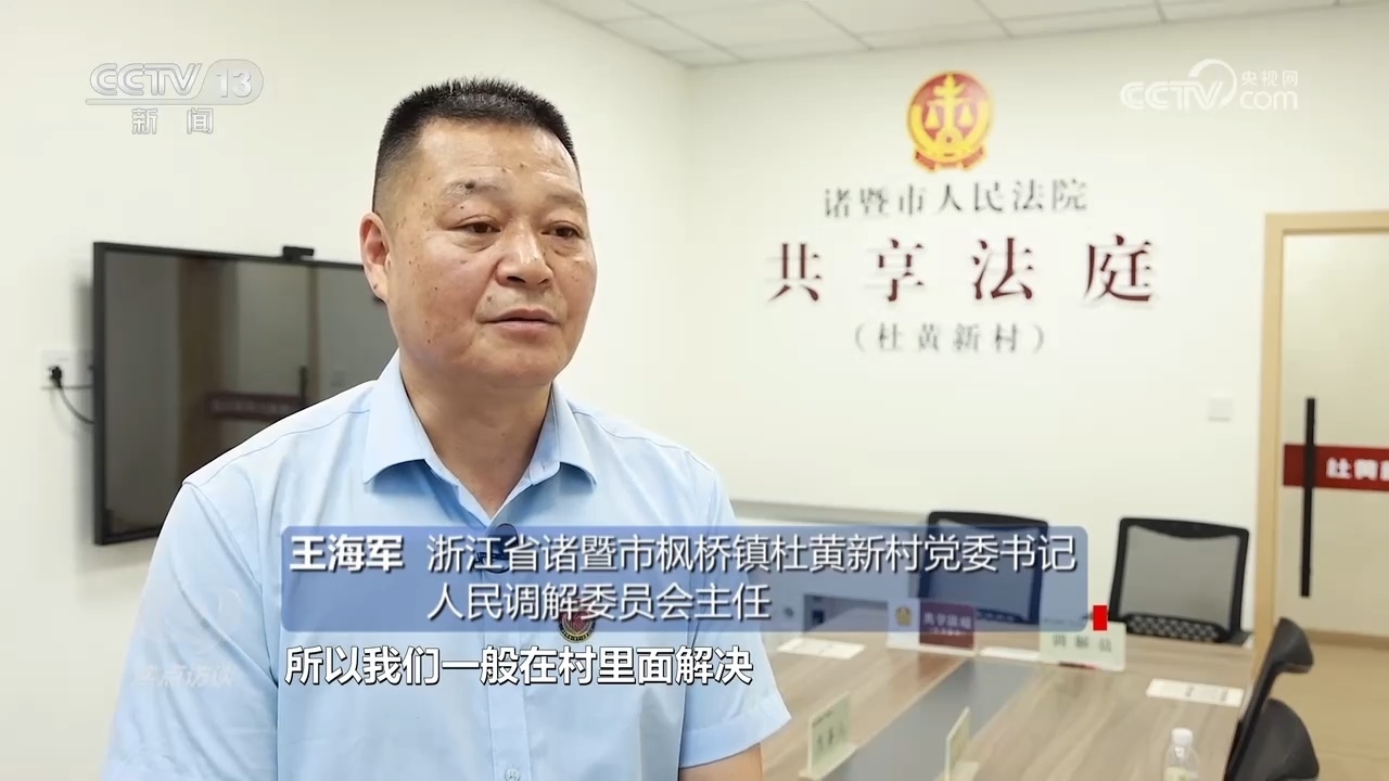 浙江省諸暨市楓橋鎮(zhèn)杜黃新村黨委書記、人民調解委員會主任王海軍:“村里一般的調解村兩委會以及村調委基本上就地解決,因為‘楓橋經(jīng)驗’矛盾不出村,所以我們一般在村里面解決。但是涉及到法律法規(guī)一塊或者有些老百姓在‘心結’上面解不開,我們就動用共享法庭?!?/p>