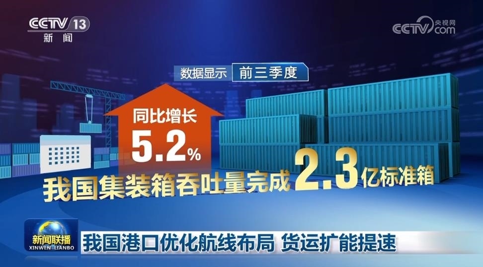 數(shù)據(jù)顯示,前三季度我國集裝箱吞吐量完成2.3億標(biāo)準(zhǔn)箱,同比增長5.2%。其中第三季度增長5.9%,增速較上半年加快1個(gè)百分點(diǎn)。
