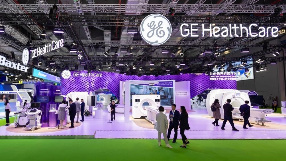 11月8日在第六屆進博會醫(yī)療器械及醫(yī)藥保健展區(qū)拍攝的GE醫(yī)療展位。