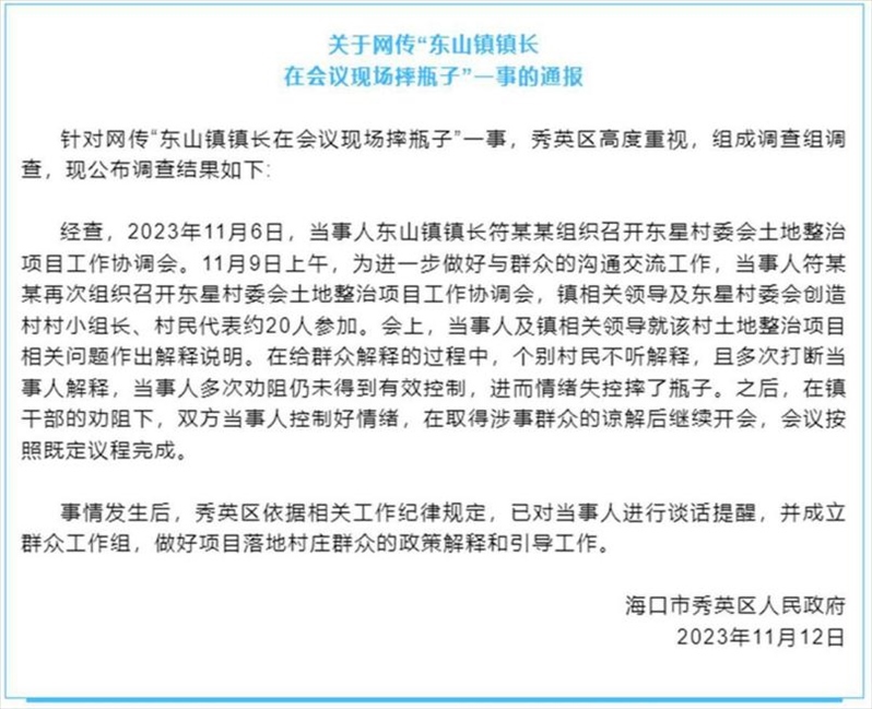 ·??谛阌^(qū)通報(bào)“東山鎮(zhèn)鎮(zhèn)長(zhǎng)在會(huì)議現(xiàn)場(chǎng)摔瓶子”:已對(duì)當(dāng)事人進(jìn)行談話提醒。