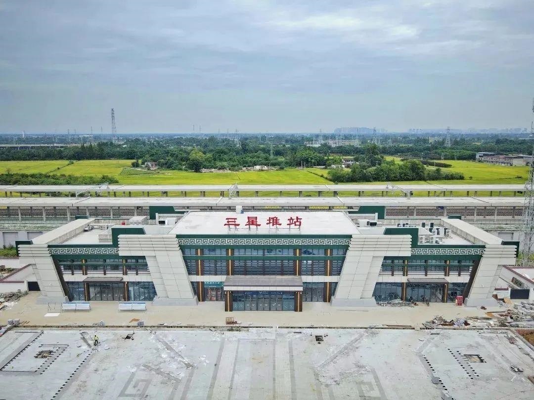 三星堆站位于廣漢市南興鎮(zhèn)與向陽鎮(zhèn)交界處,距離三星堆遺址約5公里。