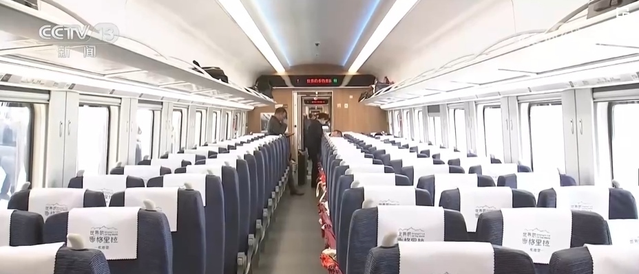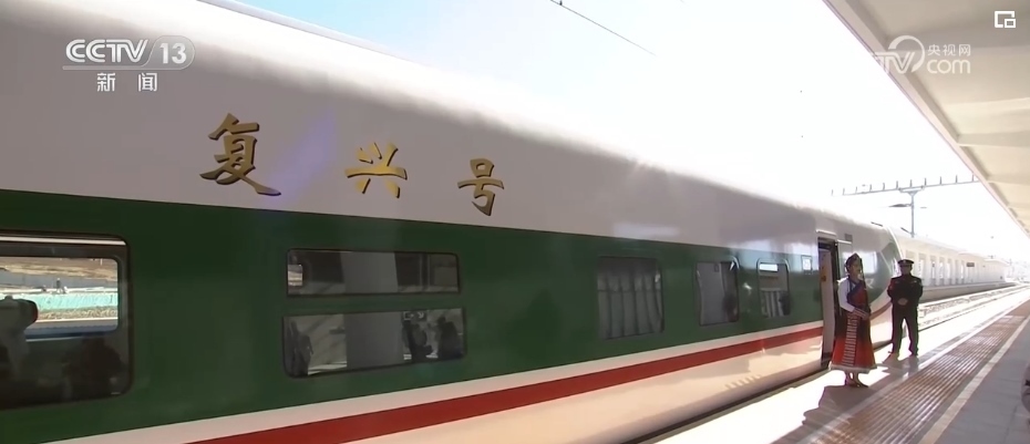 總臺(tái)記者 劉文杰:這是一款特別針對(duì)滇藏鐵路沿線高原、高寒環(huán)境設(shè)計(jì)的動(dòng)車組。整列車的涂裝是以“中國(guó)紅”為腰帶、以“國(guó)槐綠”為窗帶,用“長(zhǎng)城灰”進(jìn)行點(diǎn)綴,整體外觀大氣優(yōu)美。