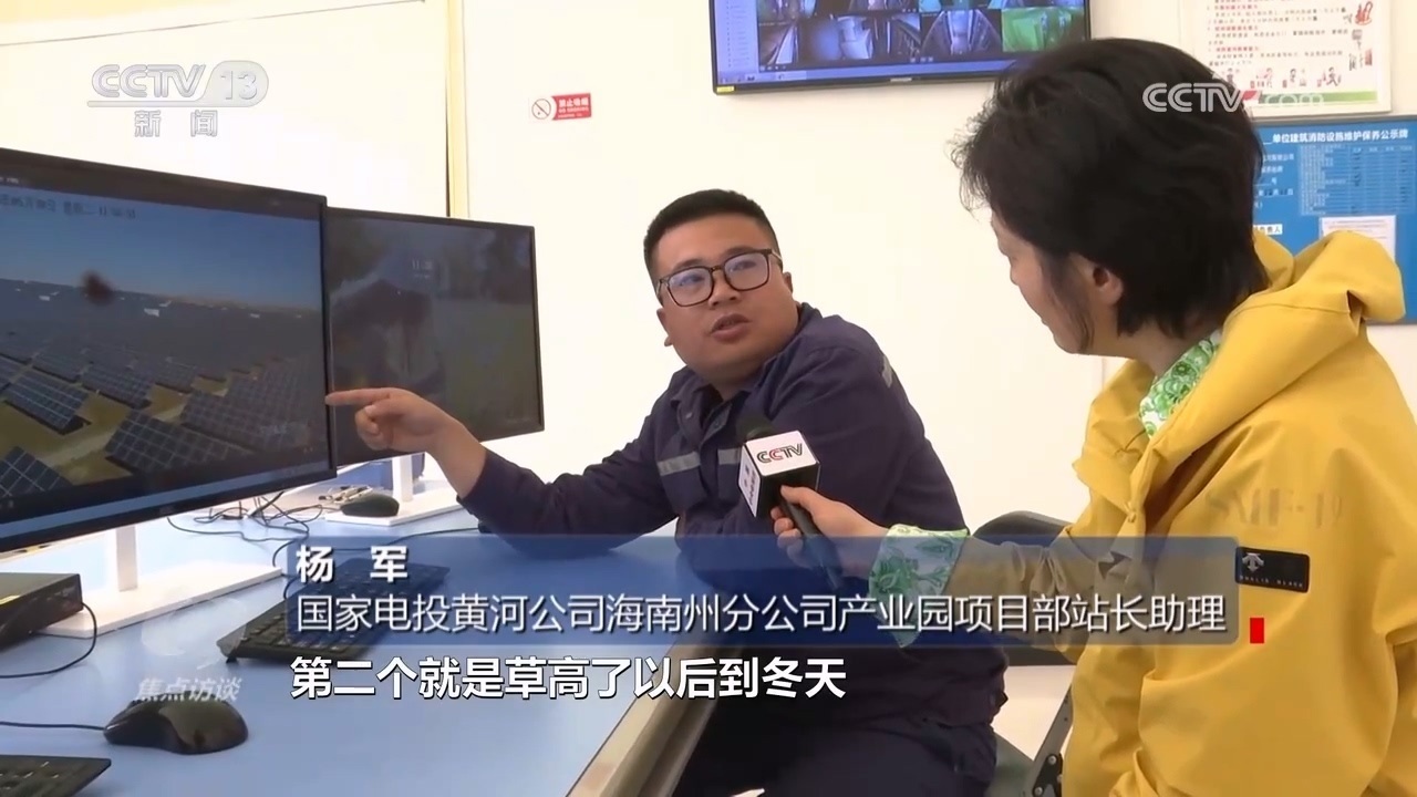 國(guó)家電投黃河公司海南州分公司產(chǎn)業(yè)園項(xiàng)目部站長(zhǎng)助理?xiàng)钴姡骸肮夥逑旅孢@些羊,就是我們請(qǐng)過(guò)來(lái)幫忙除草的。因?yàn)槊磕暌坏较奶欤瑘@區(qū)電池組件下面草就特別高,長(zhǎng)高了以后會(huì)遮擋電池組件,一個(gè)是影響發(fā)電效率,再一個(gè)秋冬季有火災(zāi)隱患?!?/p>