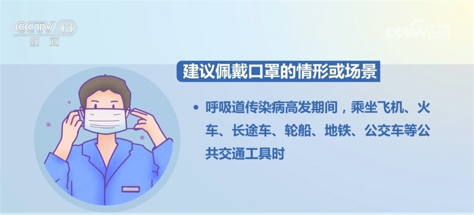 建議佩戴口罩的情形或場(chǎng)景包括:呼吸道傳染病高發(fā)期間,乘坐飛機(jī)、火車(chē)、長(zhǎng)途車(chē)、輪船、地鐵、公交車(chē)等公共交通工具時(shí)。呼吸道傳染病高發(fā)期間,進(jìn)入超市、影劇院、客運(yùn)場(chǎng)站、廂式電梯等環(huán)境密閉、人員密集場(chǎng)所時(shí)。呼吸道傳染病高發(fā)期間,老年人、慢性基礎(chǔ)疾病患者、孕婦等前往室內(nèi)公共場(chǎng)所時(shí)。與出現(xiàn)呼吸道傳染病癥狀者共同學(xué)習(xí)、生活或工作期間。