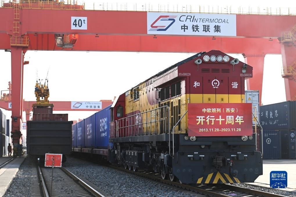 X8155次中歐班列在西安國際港站等待出發(fā)(2023年11月28日攝)。當日,滿載貨物的X8155次中歐班列從西安國際港站開往德國漢堡,標志著中歐班列(西安)自2013年11月28日開行首趟以來,已累計開行十周年。新華社記者 鄒競一 攝