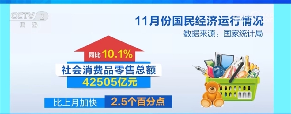 從消費(fèi)看,出行類的商品銷售改善,服務(wù)消費(fèi)潛力繼續(xù)釋放,市場銷售增勢良好。11月份社會消費(fèi)品零售總額同比增長10.1%,比上月加快2.5個(gè)百分點(diǎn),其中限額以上單位汽車類商品零售額增長14.7%,帶動作用明顯。