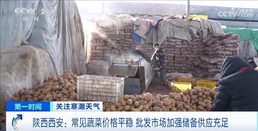 在西安一家大型農(nóng)副產(chǎn)品批發(fā)市場,為了應(yīng)對寒潮天氣帶來的影響,常年做蔬菜批發(fā)生意的戴建軍早在土豆產(chǎn)地建起庫房,大量收購?fù)炼?,增加運(yùn)輸車輛,確保土豆能及時運(yùn)到西安。