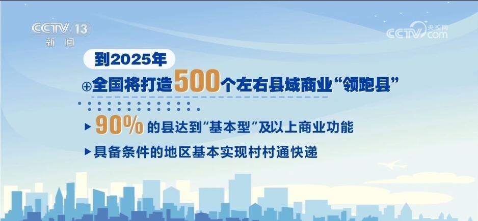 按照規(guī)劃,到2025年,全國(guó)將打造500個(gè)左右縣域商業(yè)“領(lǐng)跑縣”,90%的縣達(dá)到“基本型”及以上商業(yè)功能,具備條件的地區(qū)基本實(shí)現(xiàn)村村通快遞。