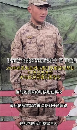 巴丁江措,第76集團(tuán)軍某旅戰(zhàn)士。2010年青海玉樹(shù)地震時(shí),解放軍幫他脫險(xiǎn)。如今,同樣成為解放軍的他奮戰(zhàn)在甘肅抗震救災(zāi)一線。他說(shuō):“我想對(duì)以前救我的人說(shuō),我?guī)椭烁嗳?,讓他們?yōu)槲因湴粒 ?/p>