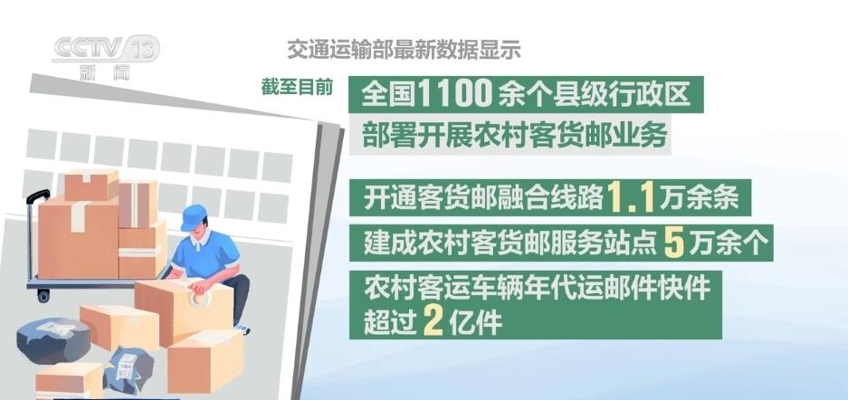 交通運(yùn)輸部最新數(shù)據(jù)顯示,截至目前,全國1100余個(gè)縣級行政區(qū)部署開展農(nóng)村客貨郵業(yè)務(wù),開通客貨郵融合線路1.1萬余條,建成農(nóng)村客貨郵服務(wù)站點(diǎn)5萬余個(gè),農(nóng)村客運(yùn)車輛年代運(yùn)郵件快件超過2億件。