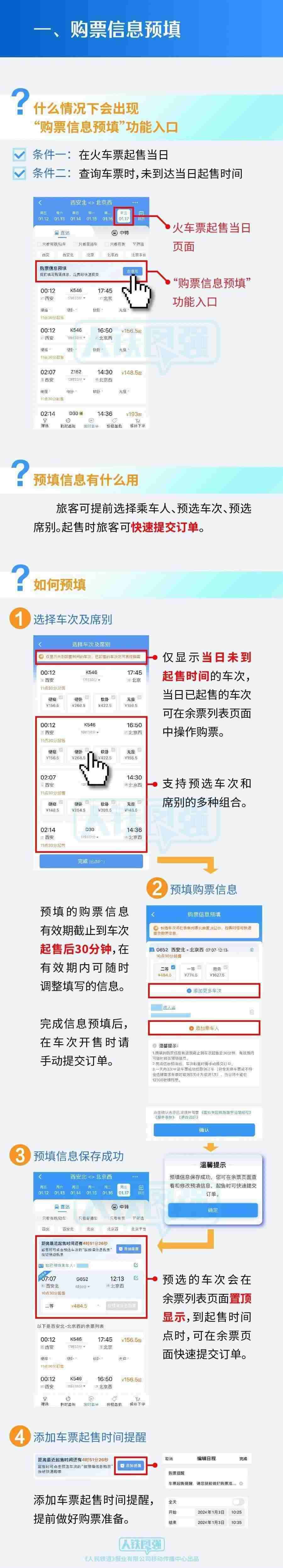 旅客朋友可于車票起售當(dāng)日,預(yù)先填寫乘車人、車次、席別等信息,在車票開始發(fā)售時(shí)一鍵提交訂單并完成支付,使旅客購(gòu)票更便捷。